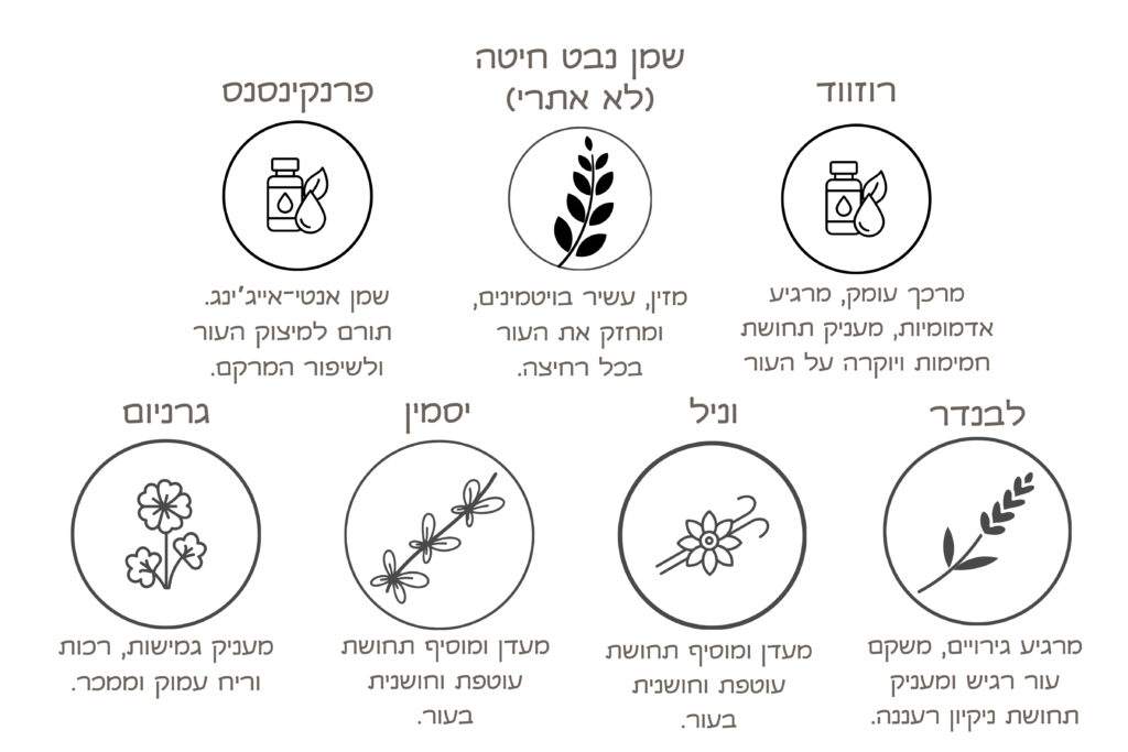הסבון המיוחד הזה נוצר בשילוב שמנים אתריים טהורים ואיכותיים,כדי להעניק לעור חוויית ניקוי וריפוי אמיתית. הוא מתאים במיוחד לעור יבש, עייף, חסר ברק, או כזה שזקוק למגע אנטי־אייג’ינג עדין.